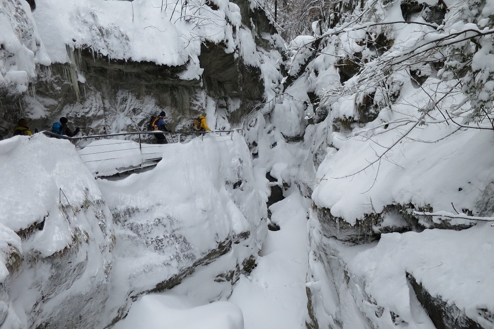 Ein tolles Abenteuer ist die Winterbegehung der Starzlachklamm bei Sonthofen. Diese Tour spielt die Vorzüge der Schneeschuhe gegenüber den Tourenskiern voll aus. Ich empfehle die im Winter berechtigt gesperrte Klamm vom Berggasthaus Alpenblick zu starten – siehe CPS Track – Rückweg 350m vor dem Parkplatz „Winkel“ in nördlicher Richtung weg-los zum Grauen Stein aufsteigen und dort auf dem roten Sommer-Wanderweg zurück zum Berggasthaus. Wenn wie bei unserer Begehung am 31.12.2014 die ganze Tour nicht einen Meter gespurt ist und über einen halben Meter Neuschnee liegt, wird es ein „Richtig hartes Unternehmen“. Nur für Bergsteiger mit entsprechender Erfahrung und Kondition (LLB Beachten) zu empfehlen. Tipp für einen gelungenen Jahreswechsel: Reservieren beim „Sterne-koch“ in der Moorhütte (Oberjoch) . Nach sehr gutem Essen von dort aus für das „Feuerwerk“ auf den kleinen Jochschrofen aufsteigen. – alle Bilder von Michael Hoffmann