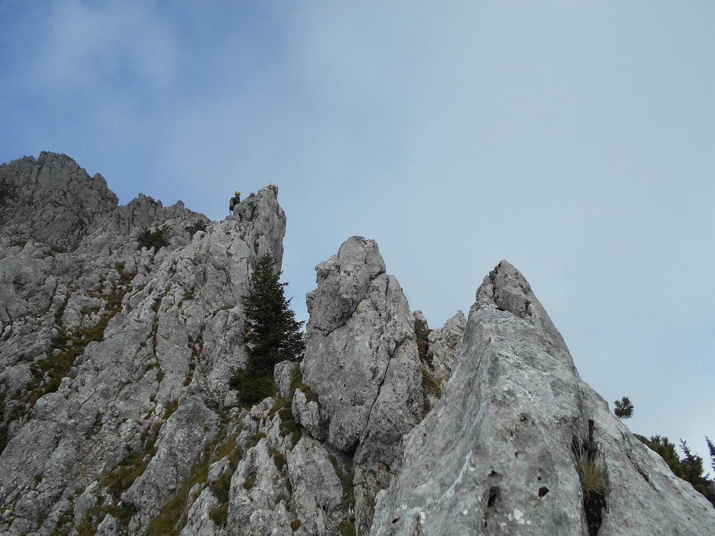 Varianten-Zustieg von Pflach über Zunderkopfjoch 1680m (1,5-2 h) – Nach 150Hm weglos durch das steile Unterholz (Schrofen) werden die unteren Zackenfelsen des Ostgrates erreicht. Zusätzlich schöne 4-6 Seillängen im 3. Grad, sind selber abzusichern (2 h). Der direkte Übergang zum Orginal-Ostgrateinstieg (8 SL IV UIAA) ist wegen einem tiefen Spalt nicht möglich. Kurz zum Steilgrashang queren und zum Orginaleinstieg hochsteigen der mit einem Bohrhaken gut erkennbar ist. (2h zum Ostgipfel)