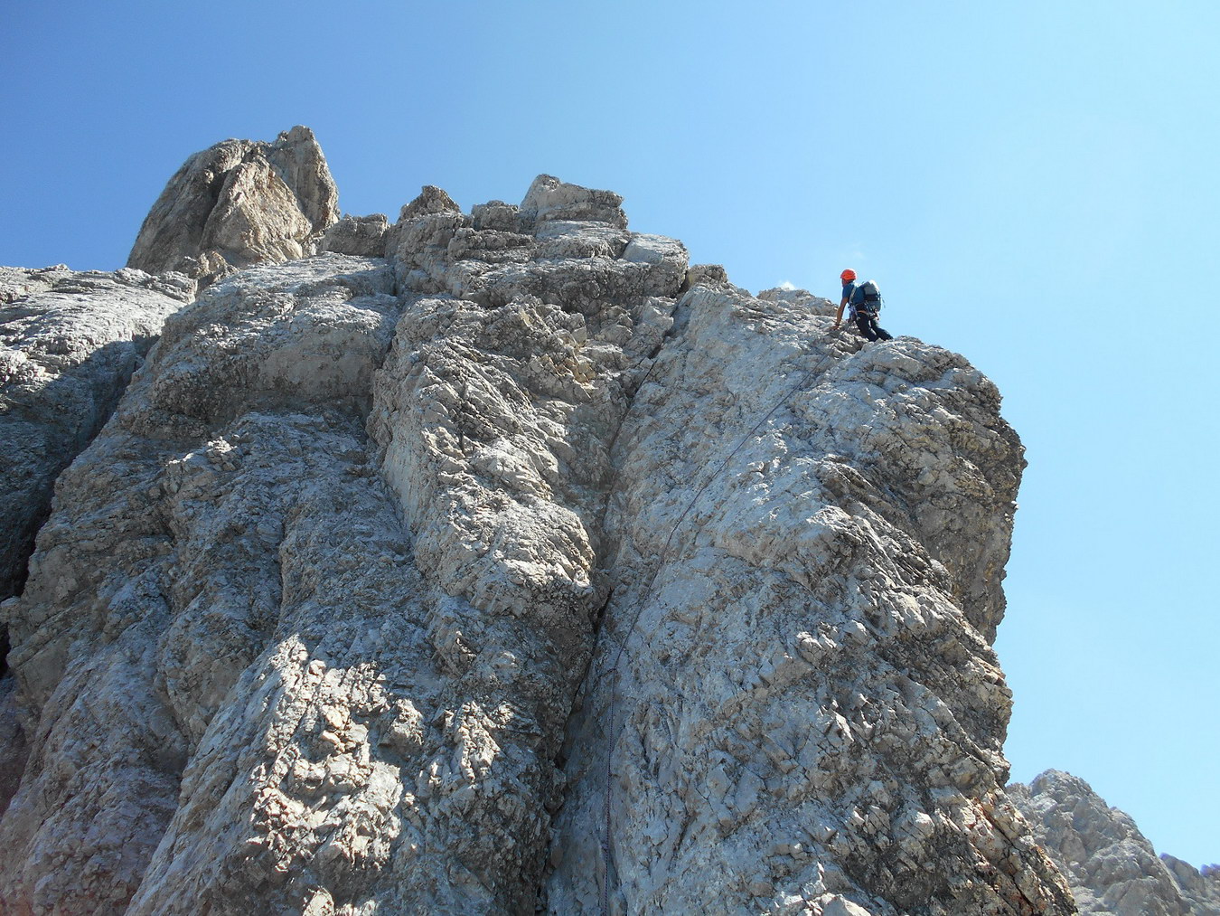 - Sicherer wegen des „Wetterstein-Schotters“ ist es, die leichten SL nicht auf den Bändern/Rinnen, sondern auf dem Fels zu klettern. Dann wird jedoch aus einer 3-UIAA-Seillänge schnell ein Fünfer – toll jedoch für den Nachsteiger